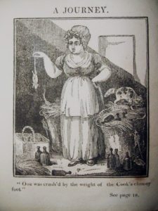Elliott was probably advised by her experienced publisher, William Darton, to use a “picnic” as a preachy fable showing how gluttony is sinful and has grievous consequences. Darton’s model was the London Pic Nic Society, a scandalous gossip item during 1802/3. [See discussions of the Pic Nic Society, The Happy Courtship, and James Gillray posted elsewhere on PicnicWit.com]