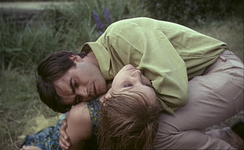 Agnes Varda. Le Bonheur (1964). Screenplay is by Agnes Varda. François, as François Chevalier, holds Claire Drouot as Thérèse Chevalier, who has just committed suicide by drowning.